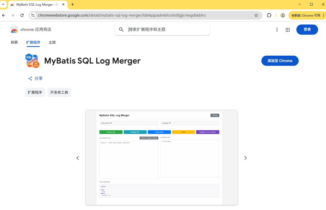 这个插件的优势还是比较明显的,MyBatis SQL Log Merger插件是一个真正解决开发和运维痛点的工具。它不仅在开发阶段能大幅提升调试效率,在生产环境中也能帮助快速定位和分析SQL相关问题。强烈推荐给每一个有需要的javer开发小伙伴🙂,有兴趣的小伙伴可以直接在谷歌浏览器上点进行下载体验