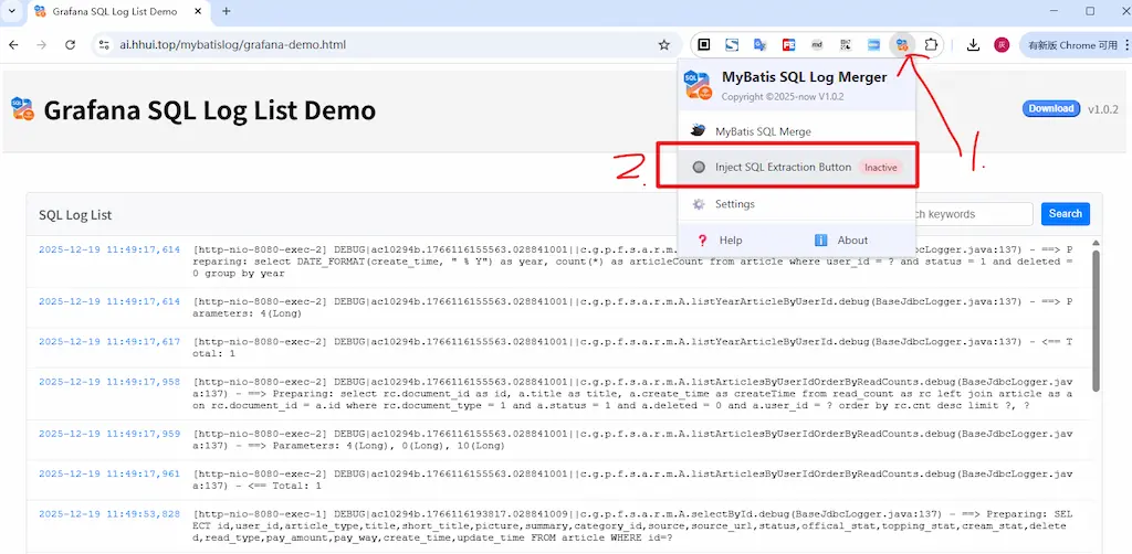 MyBatis SQL Log Merger图标,在弹出窗口中,点击非活动状态指示器旁边的"注入 SQL 提取按钮"切换开关 - 复制SQL:直接复制包含SQL模板和SQL参数的两行日志