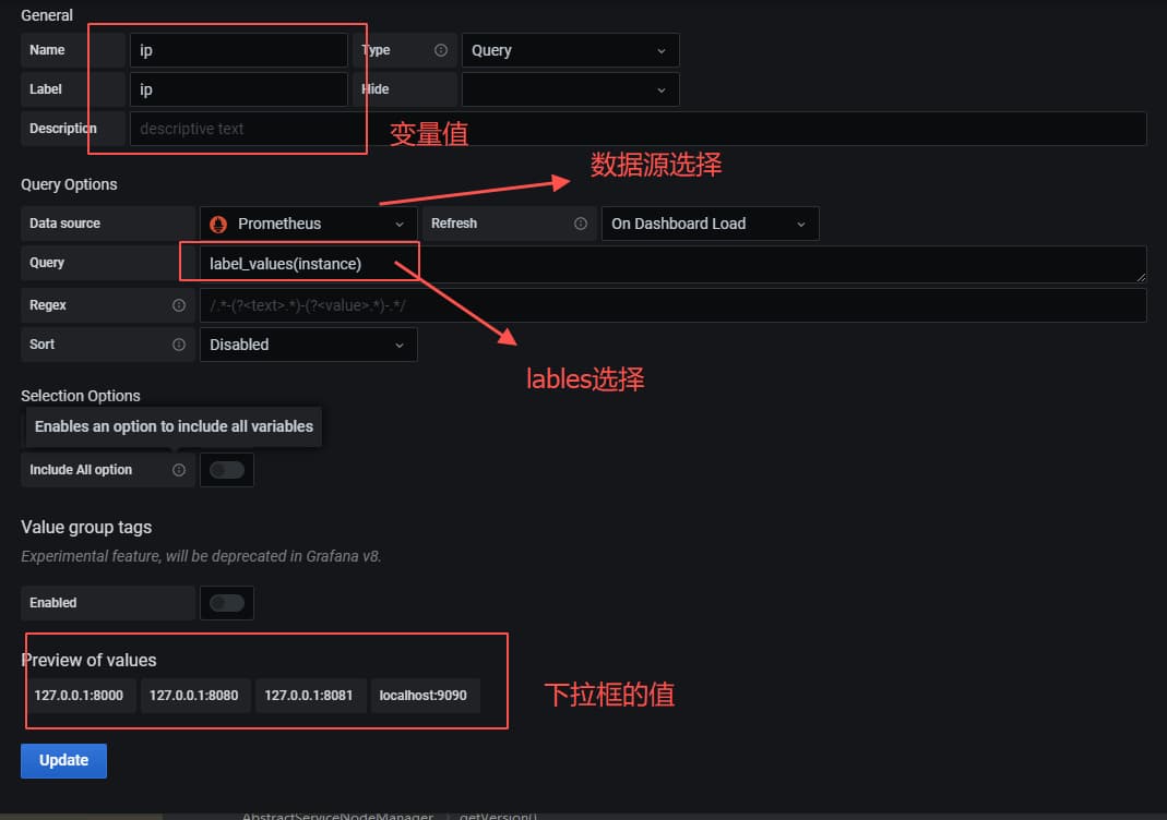 借助Grafana的变量配置来实现大盘的条件筛选,其中变量配置关键点在于