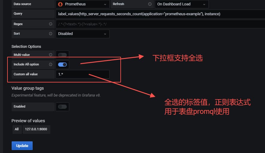 其次在大盘的metric配置中,对于include all的支持,关键点在于promql的使用
